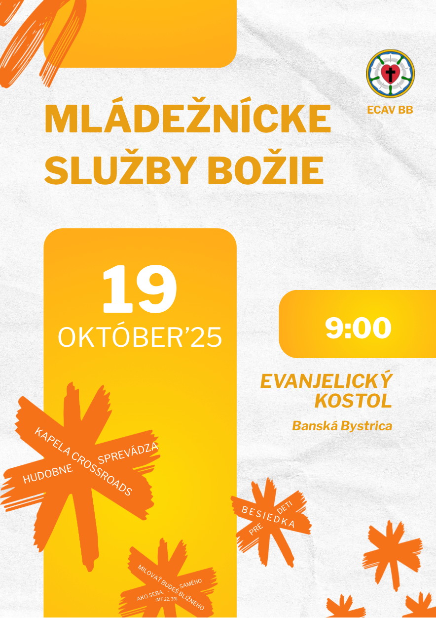 Pozvánka na mládežnícke služby Božie 19.10.2025 13. októbra 2025 Pozývame na októbrové mládežnícke služby Božie v nedeľu 19.10.2025 do Evanjelického chrámu v Banskej Bystrici.