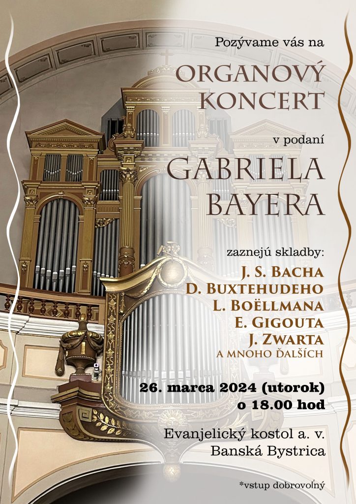 Pozývame vás na organový koncert v podaní Gabriela Bayera, ktorý sa uskutoční v utorok 26. marca 2024 o 18:00 v Evanjelickom kostole na Lazovnej ulici v Banskej Bystrici.Na koncerte zaznejú skladby J. S. Bacha, D. Buxtehudeho, L. Boëllmana, E. Gigouta, J. Zwarta a mnoho ďalších.