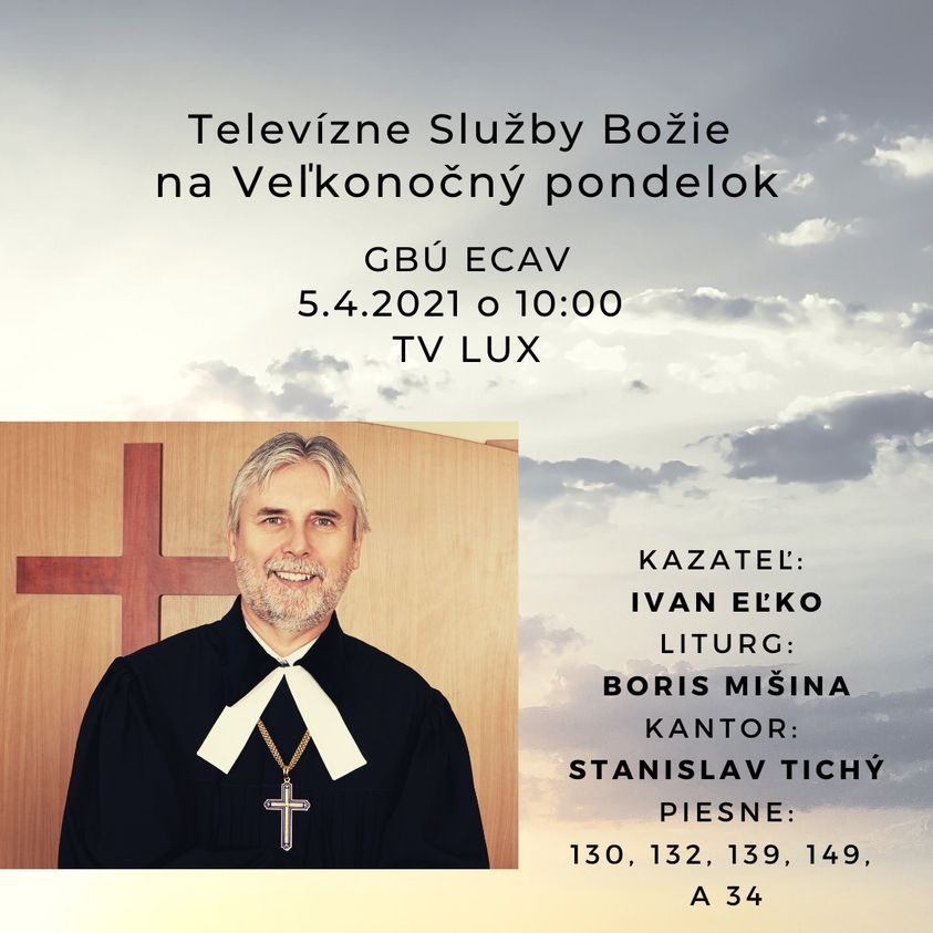 Televízne služby Božie na Veľkonočný pondelok 4. apríla 2021 Na veľkonočný pondelok Vám dávame do pozornosti televízne služby Božie na TV LUX o 10:00, kázať bude brat biskup Ivan Eľko.